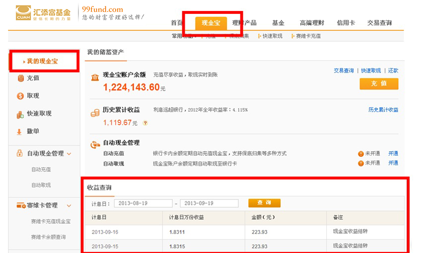現(xiàn)金寶每日計算收益,累計收益是指現(xiàn)金寶賬戶每日收益的總和。