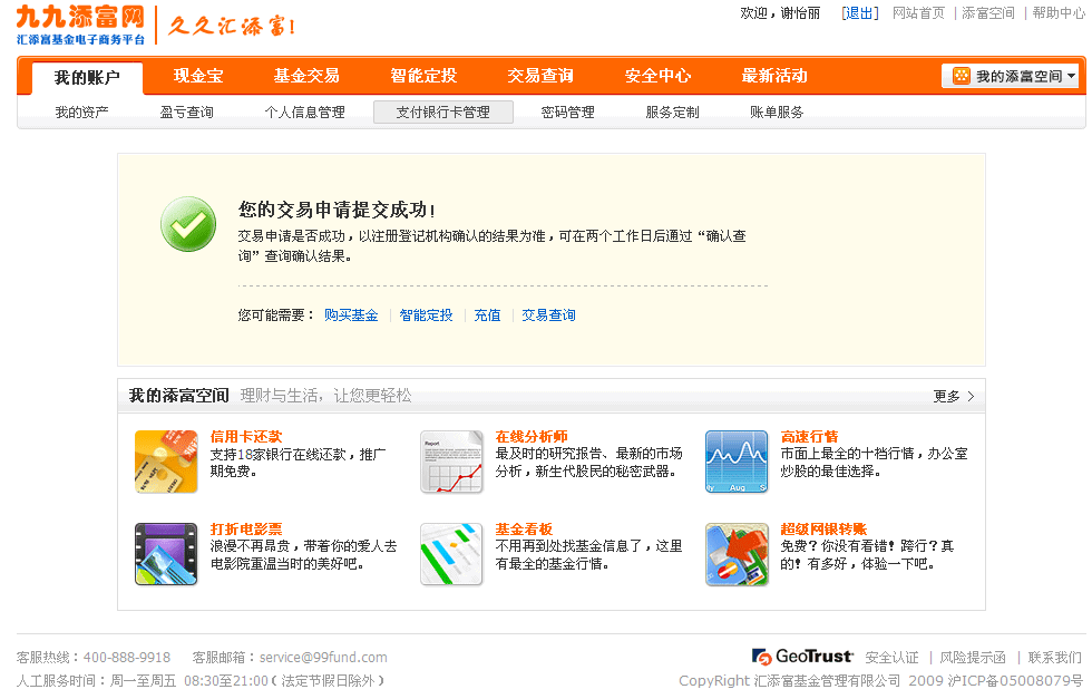 客服電話:400-888-9918(免長途話費)客服郵箱:service@99fund.com人工服務(wù)時間:交易日早8:30-晚21:00 雙休日8:30-17:00